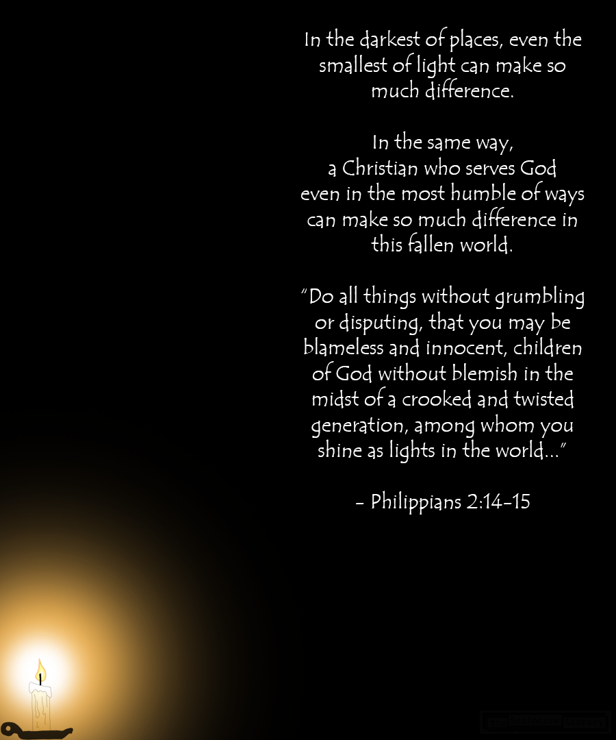 This metaphor supports the previous message about working out our salvation. But this time, Paul emphasizes the magnitude of the effect of even the simplest acts of service. In a dark room, even a small light can make so much difference. No matter how small it is, a light attracts attention and hope. In the same way, Christians who serve God even in the humblest of ways function like lights in this dark and fallen world. Therefore, this is an encouragement for us to continue serving God no matter how big or small our role in the body of Christ is.
