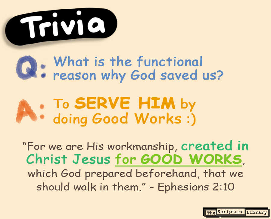 First, Paul’s main message is that the Philippians should “work out their salvation.” This verse is often misinterpreted as suggesting works-based salvation. With just proper grammar and semantic analysis, it is clear that Paul is not teaching us to “work for” our salvation; he is teaching us to work it out. In other words, he wants us to live it out. The best way to understand this command is by learning first the functional reason why God saved us. And according to Paul’s letter to the Ephesians, GOD SAVED US TO SERVE HIM BY DOING GOOD WORKS.