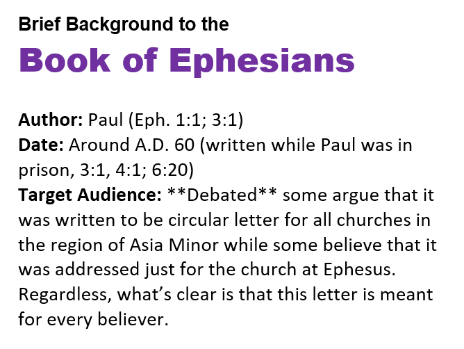 Welcome to our Bible study of Paul’s Letter to the Ephesians!!