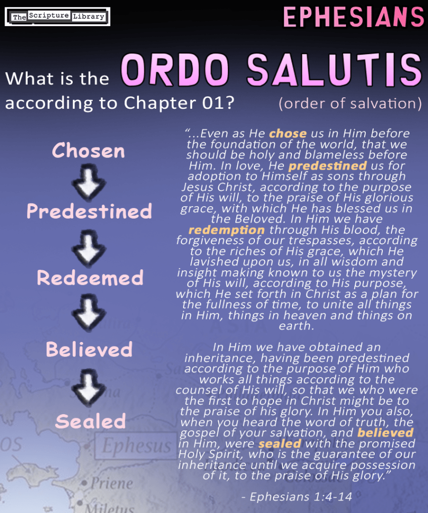 Here is the Ordo Salutis (Order of Salvation) as presented in this chapter. Notice that this doesn’t contradict the Ordo Salutis that Paul taught in his letter to the Romans (8:29-30).